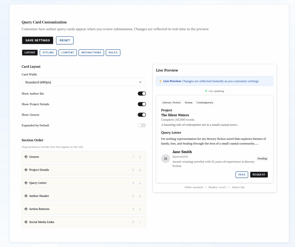 Choose what appears on your customizable query cards—from project details to visual styling—so you decide how your submissions are presented and prioritized.