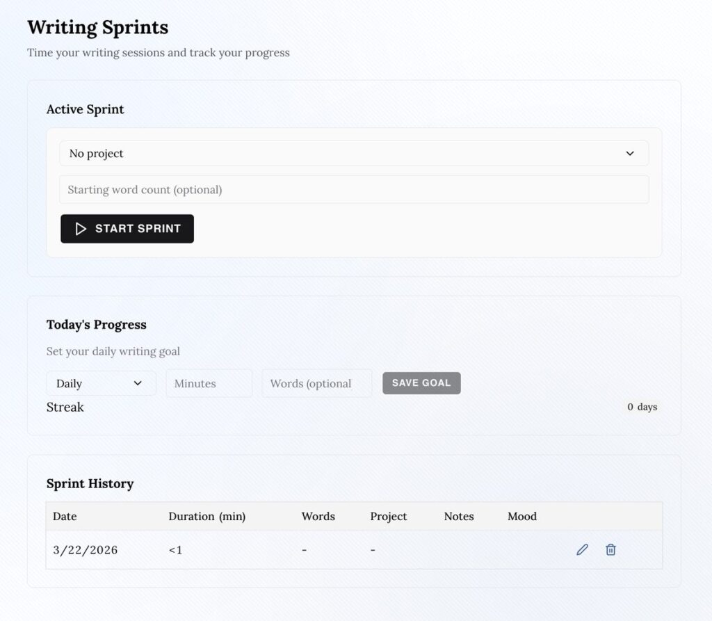 - Pick a project — tie your sprint to a specific manuscript so your progress stays organized